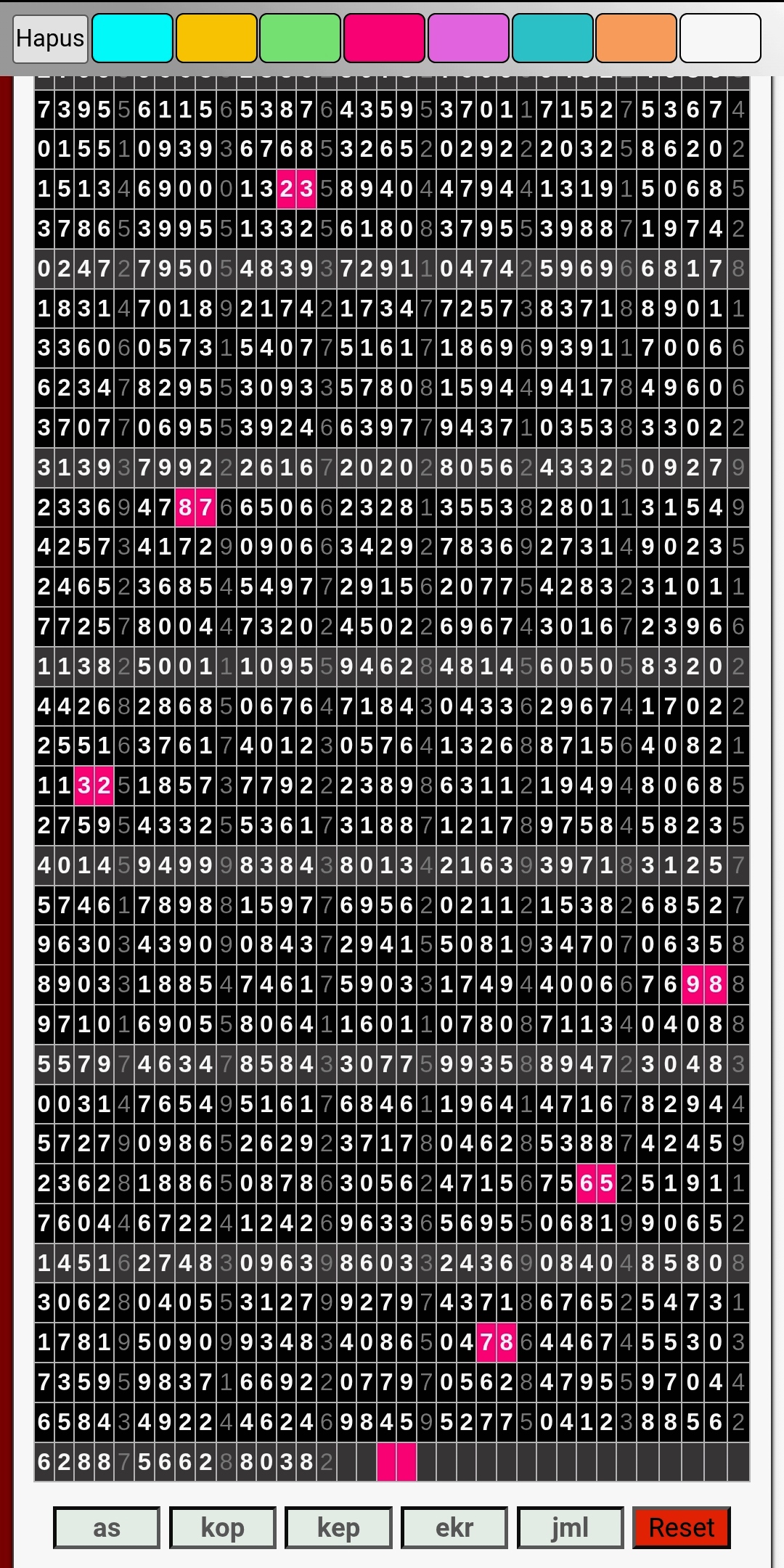 | Rumus Angka Mati berdasarkan kepala harian | 08 09 10 16 17 19 20 27 28 30 31 32 37 38 39 40 41 42 43 48 49 50 51 52 54 59 60 62 63 65 74 75 76 85 86 87 96 97 98 |