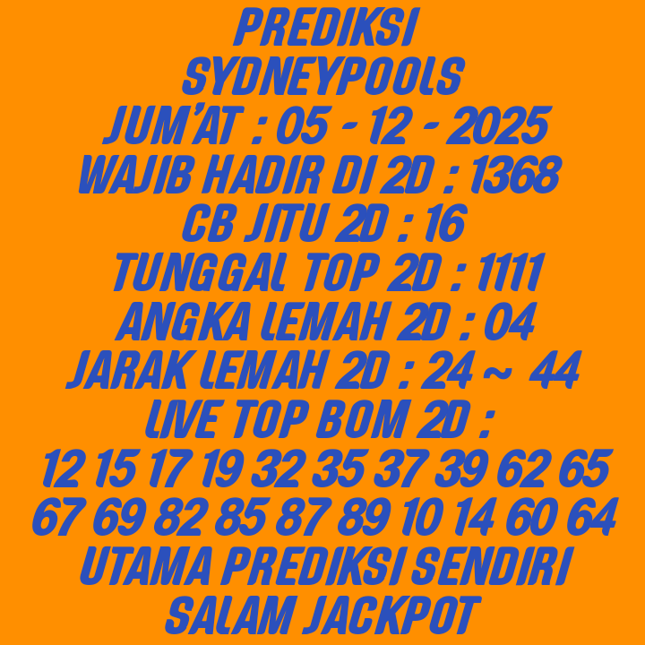 Prediksi Sydneypools Kamis, 04-12-2025 Merupakan Prediksi Otomatis yang menggabungkan Metode Kalender Togel Dengan LN Generator yang akurasi prediksinya sudah kita ketahui bersama. Jadi harap Maklum Jika kadang meleset Prediksi Sydneypools kita. Jadikan ini sebagai perbandingan saja dan tetap Utamakan karya sendiri