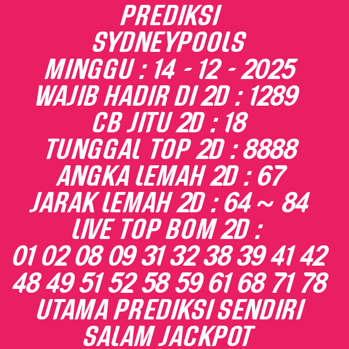Prediksi Sydneypools Kamis, 11-12-2025 Merupakan Prediksi Otomatis yang menggabungkan Metode Kalender Togel Dengan LN Generator yang akurasi prediksinya sudah kita ketahui bersama. Jadi harap Maklum Jika kadang meleset Prediksi Sydneypools kita. Jadikan ini sebagai perbandingan saja dan tetap Utamakan karya sendiri