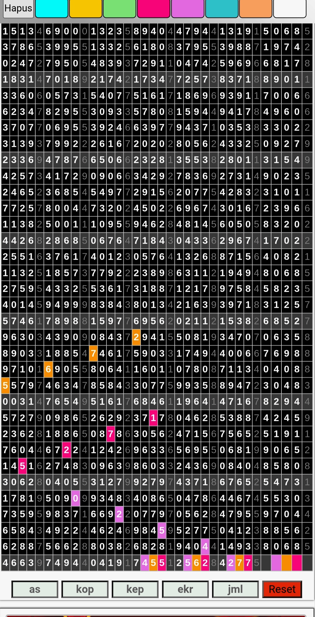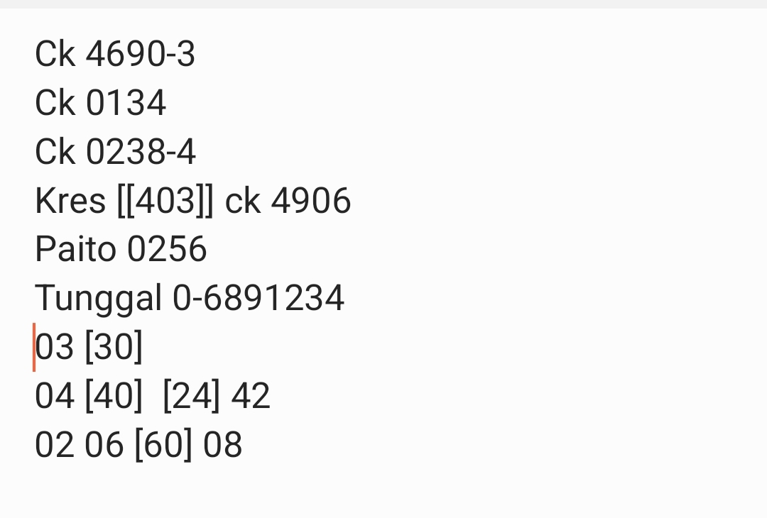 | Rumus Angka Mati berdasarkan kepala harian | 04 06 07 09 10 18 19 20 21 29 30 31 32 42 43 50 51 53 54 61 62 64 71 72 73 74 75 76 82 83 84 85 86 87 93 94 95 96 98 |