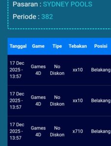 Prediksi Sydneypools Kamis, 18-12-2025 Merupakan Prediksi Otomatis yang menggabungkan Metode Kalender Togel Dengan LN Generator yang akurasi prediksinya sudah kita ketahui bersama. Jadi harap Maklum Jika kadang meleset Prediksi Sydneypools kita. Jadikan ini sebagai perbandingan saja dan tetap Utamakan karya sendiri