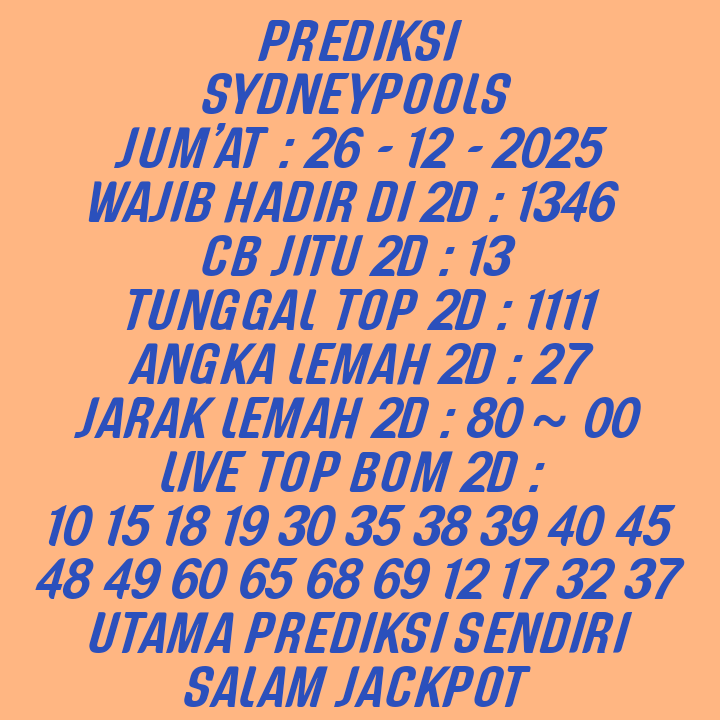 Prediksi Sydneypools Selasa, 02-12-2025 Merupakan Prediksi Otomatis yang menggabungkan Metode Kalender Togel Dengan LN Generator yang akurasi prediksinya sudah kita ketahui bersama. Jadi harap Maklum Jika kadang meleset Prediksi Sydneypools kita. Jadikan ini sebagai perbandingan saja dan tetap Utamakan karya sendiri