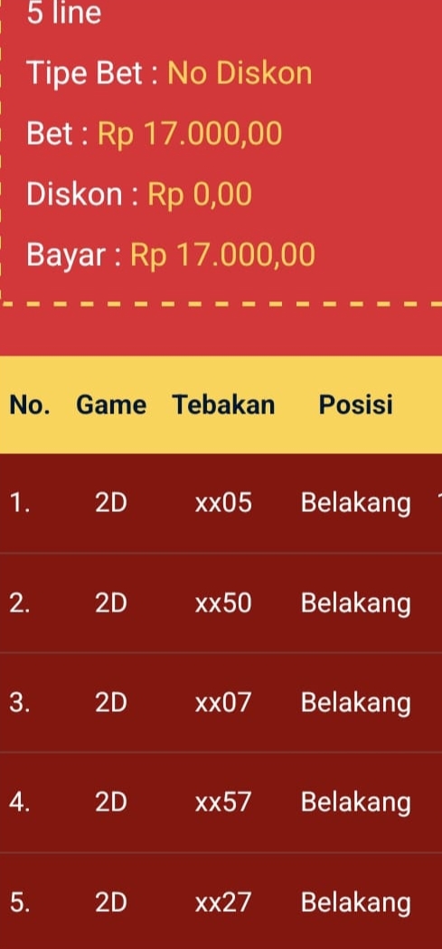 | Rumus Angka Mati berdasarkan kepala harian | 08 09 10 16 17 19 20 27 28 30 31 32 37 38 39 40 41 42 43 48 49 50 51 52 54 59 60 62 63 65 74 75 76 85 86 87 96 97 98 |