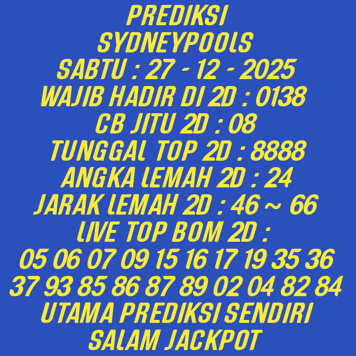 Prediksi Sydneypools Sabtu, 27-12-2025 Merupakan Prediksi Otomatis yang menggabungkan Metode Kalender Togel Dengan LN Generator yang akurasi prediksinya sudah kita ketahui bersama. Jadi harap Maklum Jika kadang meleset Prediksi Sydneypools kita. Jadikan ini sebagai perbandingan saja dan tetap Utamakan karya sendiri