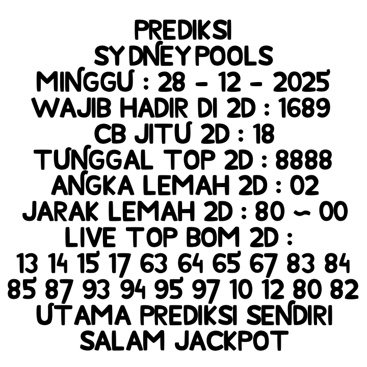 Prediksi Sydneypools Jumat, 12-12-2025 Merupakan Prediksi Otomatis yang menggabungkan Metode Kalender Togel Dengan LN Generator yang akurasi prediksinya sudah kita ketahui bersama. Jadi harap Maklum Jika kadang meleset Prediksi Sydneypools kita. Jadikan ini sebagai perbandingan saja dan tetap Utamakan karya sendiri
