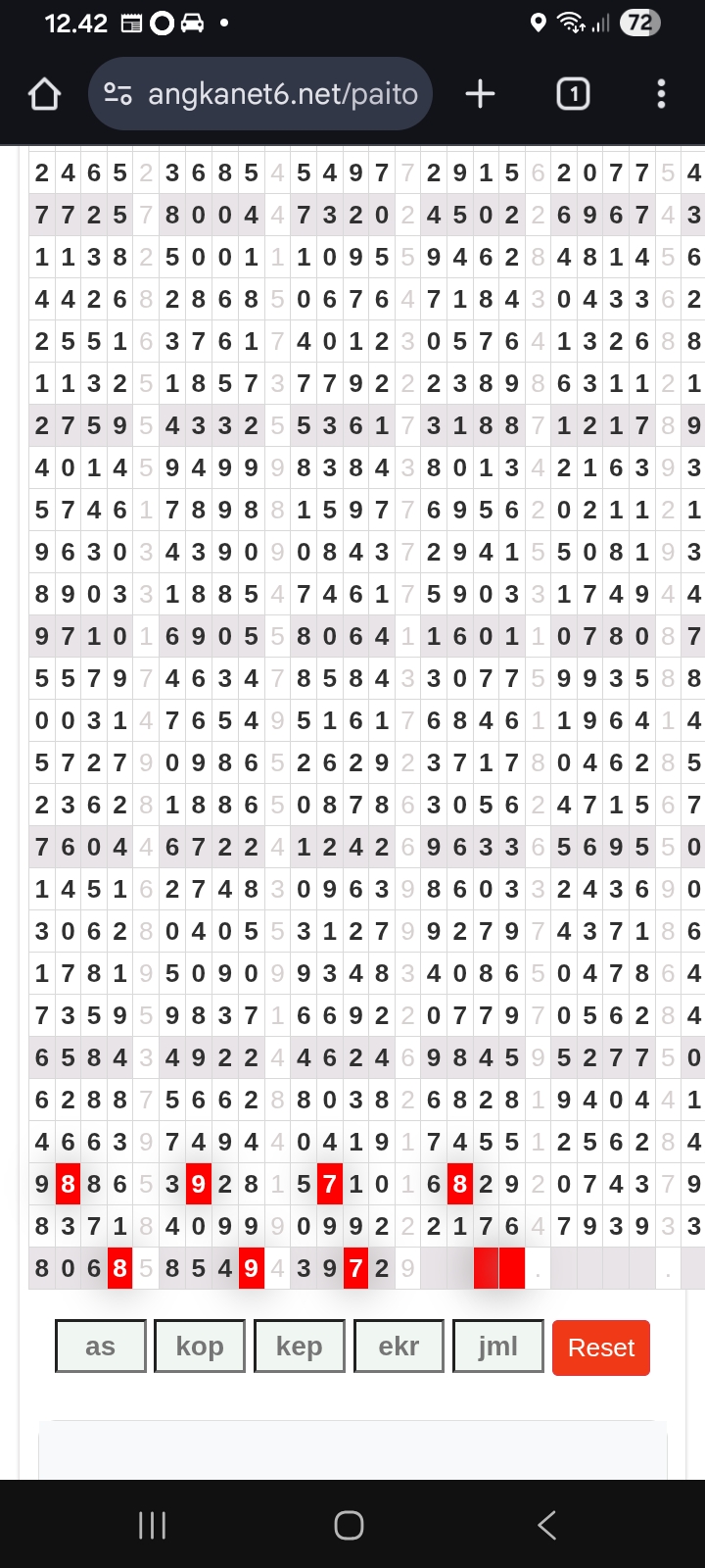 | Rumus Angka Mati berdasarkan kepala harian | 07 08 09 10 18 19 20 21 31 32 38 39 40 42 49 50 51 52 53 54 59 60 61 62 63 64 65 71 72 73 74 76 82 84 85 87 96 97 98 |