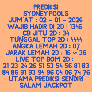 Prediksi Sydneypools Sabtu, 06-12-2025 Merupakan Prediksi Otomatis yang menggabungkan Metode Kalender Togel Dengan LN Generator yang akurasi prediksinya sudah kita ketahui bersama. Jadi harap Maklum Jika kadang meleset Prediksi Sydneypools kita. Jadikan ini sebagai perbandingan saja dan tetap Utamakan karya sendiri