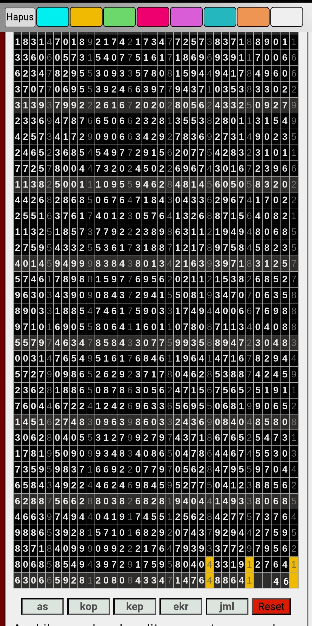 | Rumus Angka Mati berdasarkan kepala harian | 04 05 06 07 09 10 15 17 18 20 21 29 30 31 32 41 42 43 53 54 61 62 64 65 72 73 75 82 83 84 85 86 87 93 94 95 96 97 98 |