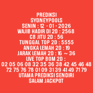 Prediksi Sydneypools Selasa, 06-01-2026 Merupakan Prediksi Otomatis yang menggabungkan Metode Kalender Togel Dengan LN Generator yang akurasi prediksinya sudah kita ketahui bersama. Jadi harap Maklum Jika kadang meleset Prediksi Sydneypools kita. Jadikan ini sebagai perbandingan saja dan tetap Utamakan karya sendiri