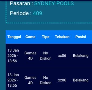 Prediksi Sydneypools Sabtu, 10-01-2026 Merupakan Prediksi Otomatis yang menggabungkan Metode Kalender Togel Dengan LN Generator yang akurasi prediksinya sudah kita ketahui bersama. Jadi harap Maklum Jika kadang meleset Prediksi Sydneypools kita. Jadikan ini sebagai perbandingan saja dan tetap Utamakan karya sendiri